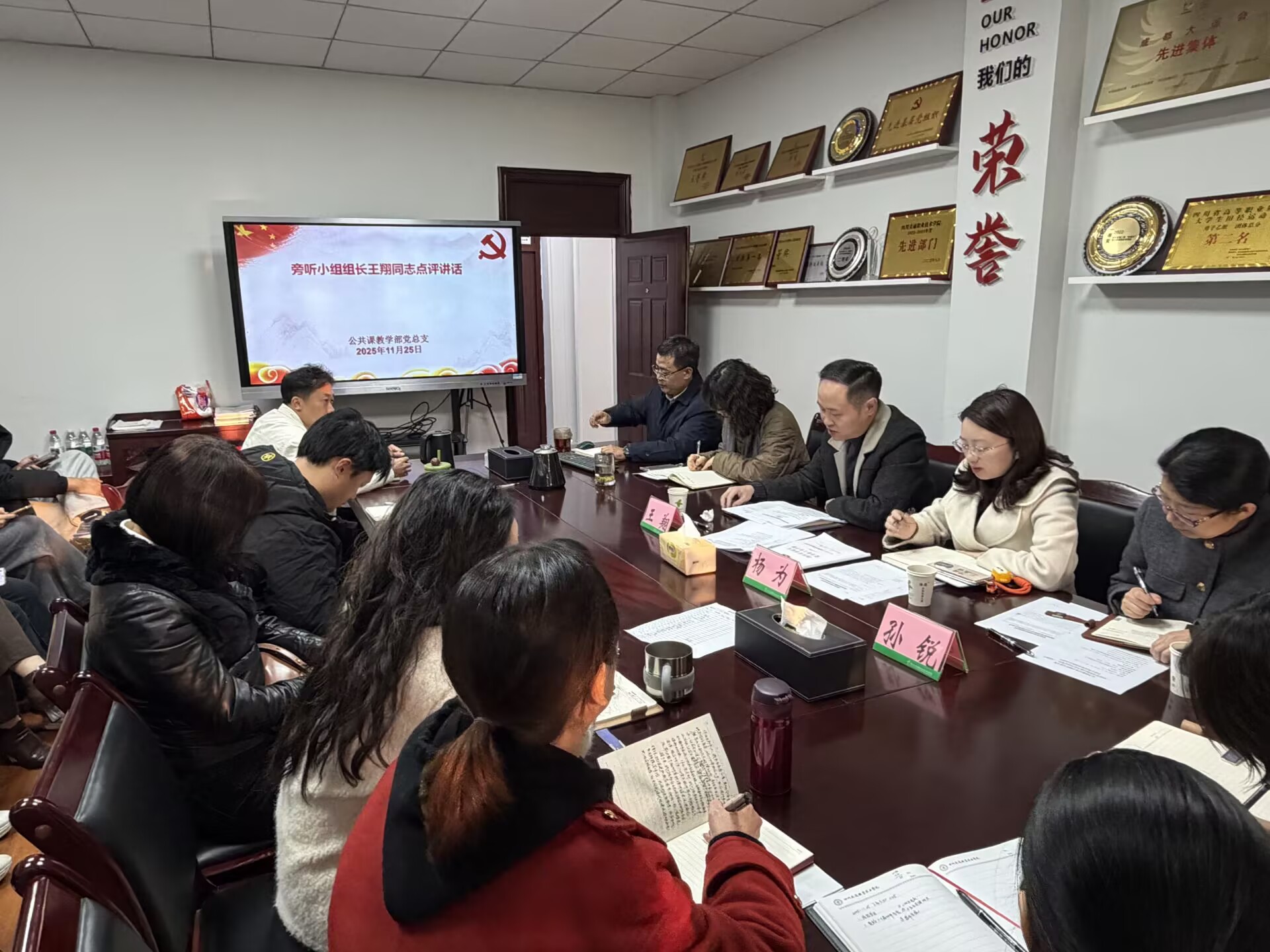 2025年11月25日下午,公共课教学部党总支精心组织了一场学习党的二十届四中全会精神的政治理论学习会。公共课教学部全体教职工参加会议,学院列席旁听小组相关人员旁听督导。